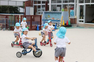 週に一度、幼年体育専門(スポーツクラブトライル)の先生を迎え、体力と運動能力の向上、夏はプールで水に慣れる指導を行っています。