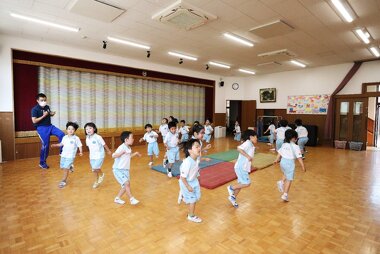 器機体操(マット.跳箱.鉄棒)、縄跳び.ボール運動.楽しいゲームなど、幼児の心身の発達にわせて指導を行っています。