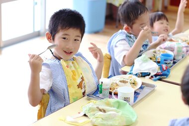 月曜日~金曜日まで5日間全員給食(午前保育は除く)