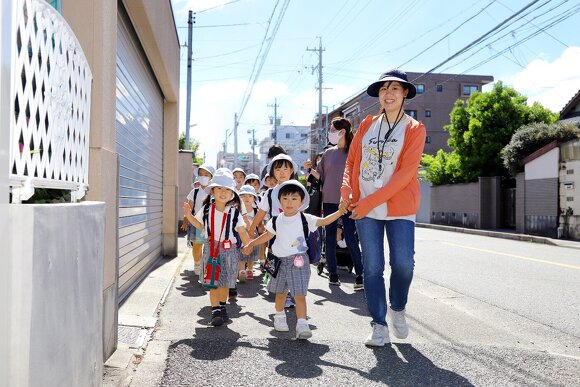 年長児が年少児を思いやり道路の内側にして歩くなど、優しい心も育ち、地域の方々と挨拶することで社会性も育っていきます。